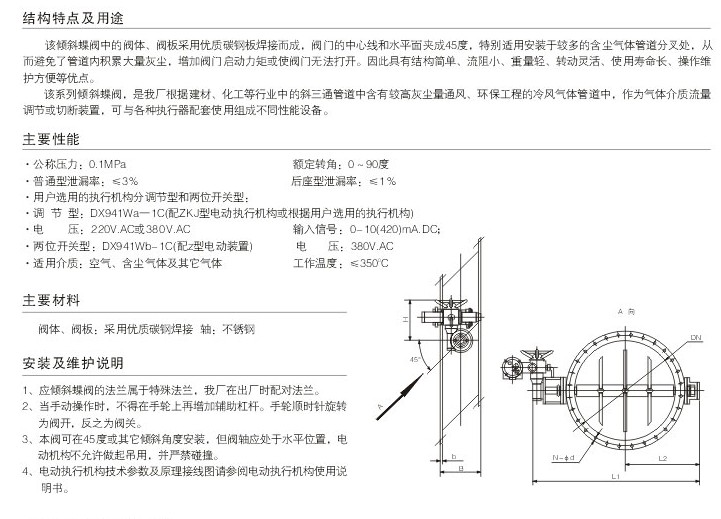 傾斜式閥門為百葉、多軸式的結構、軸座采用組裝式結構、便于維修。密封填料采用柔性石黑,密封比壓可調,閥板流線結構,流阻小,流動均勻,啟閉力矩小,動作靈敏,性能可靠。